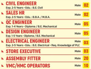 Positions :- Civil Engineer, Sales HR, QC Engineer, Design Engineer, Electrical Engineer, Store Executive, Assembly Fitter, VMC/HMC Operators